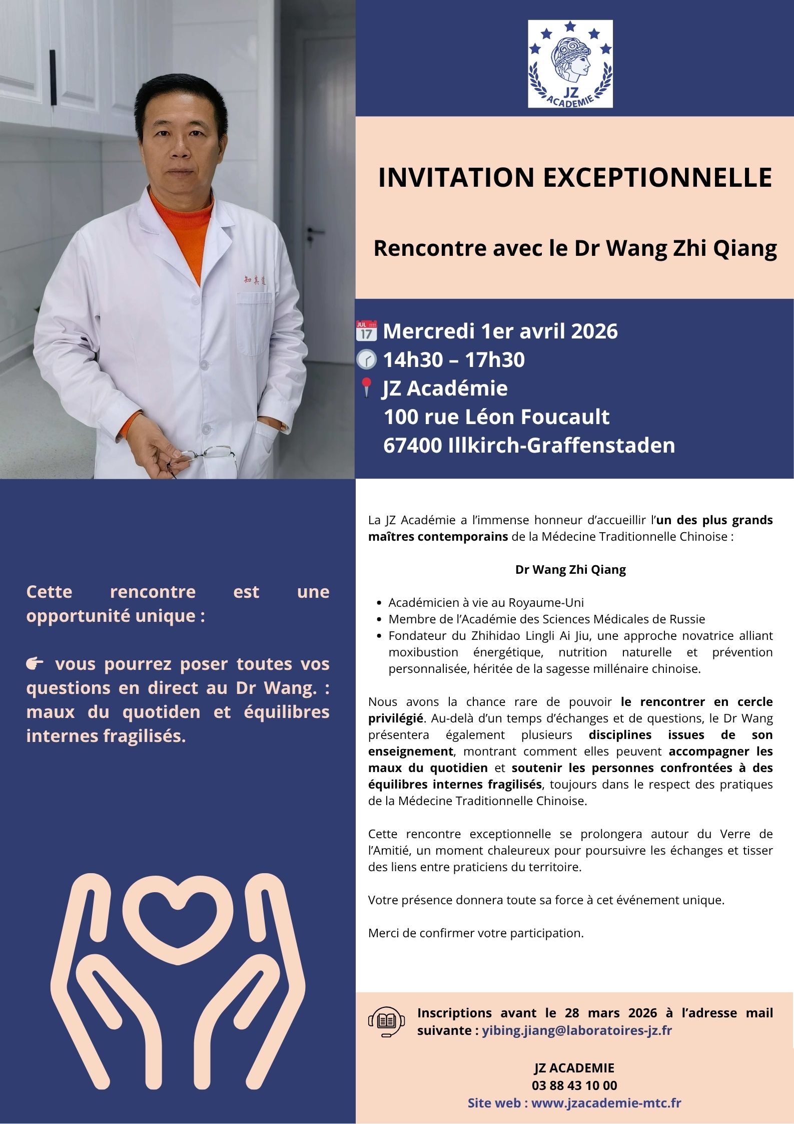 Celle‑ci aura l’honneur d’accueillir le Dr Wang Zhi Qiang, Maître internationalement reconnu en Médecine Traditionnelle Chinoise et fondateur du Zhihidao Lingli Ai Jiu.